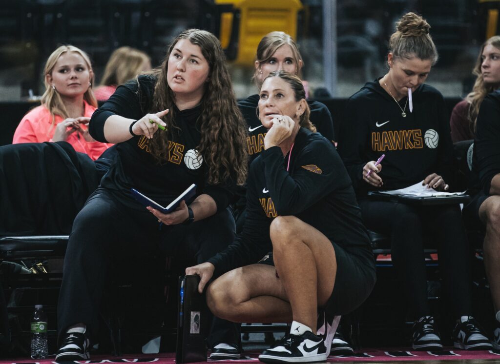 The Hawkettes outhit Dowling by a .151 to .139 margin in a match that lasted nearly two hours. They overcame a 2-1 deficit by hitting .333 in Set 4 and .353 in Set 5 after struggling to a -.100 hitting efficiency in Set 3.
