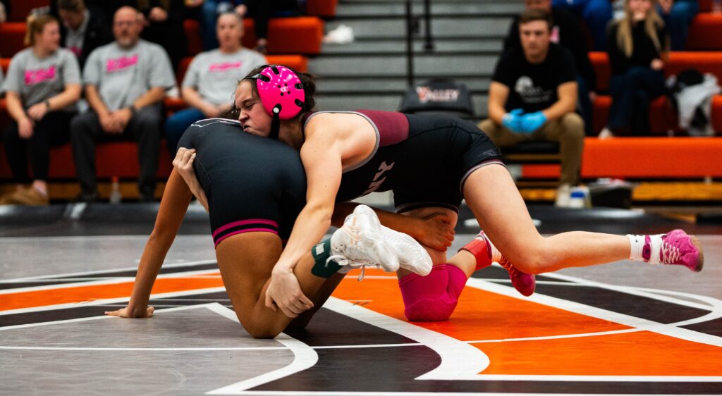 Sophomore Bradlynn Virchow continued to make the most of her varsity starts by recording another fall at 120. She got leg control over WDM’s Eden Fitzgerald, turned it into a takedown before also getting a cradle locked in for the pin at 1:25.