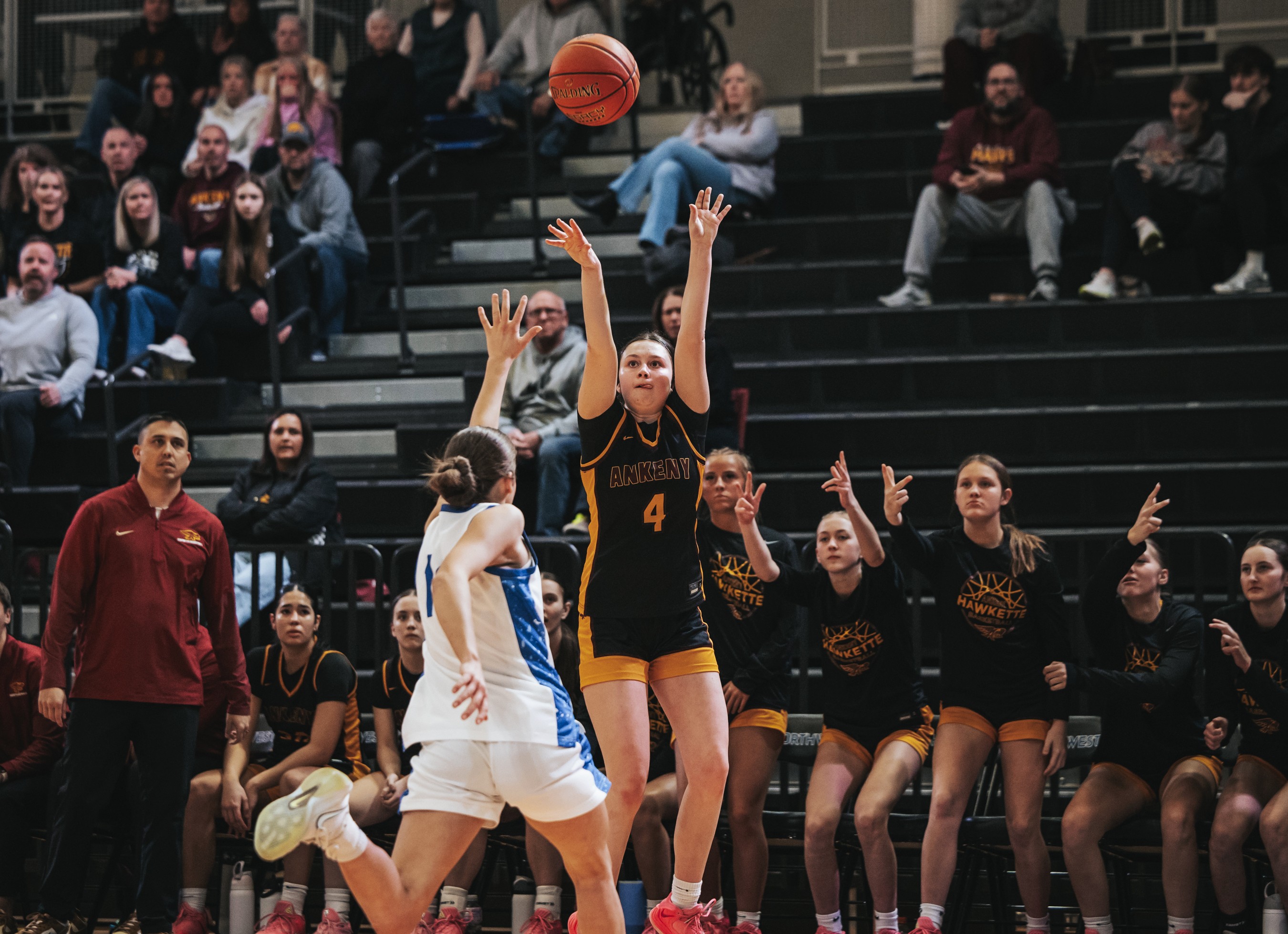 The Hawkettes got a couple pairs of baskets from senior Jayla Williams and freshman Ali Aguirre, along with a pair of 3-pointers from seniors Ainsley Kiene and Reagan Baldwin that helped Ankeny take the lead three times in the first quarter.