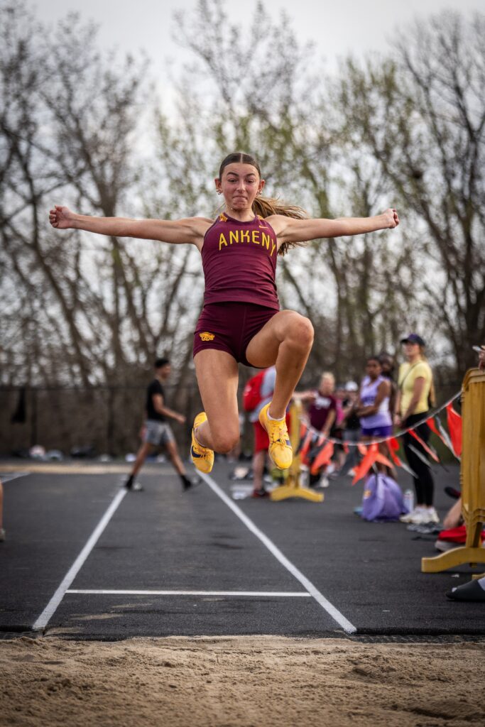 Lena Bruening was the runner-up in the long jump with a leap of 18-10.75. She moved ahead of Ankeny assistant coach Laura Jumper and into second place on the school’s all-time list.