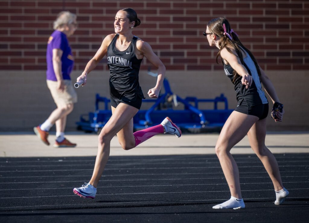 Woods anchored Centennial to a victory in the 4×100 relay. She teamed up with Taylor Gilbreaith, Aly Balashaitis and Bella Buesch to post a time of 49.57 seconds, which ranks No. 8 in Iowa this year.