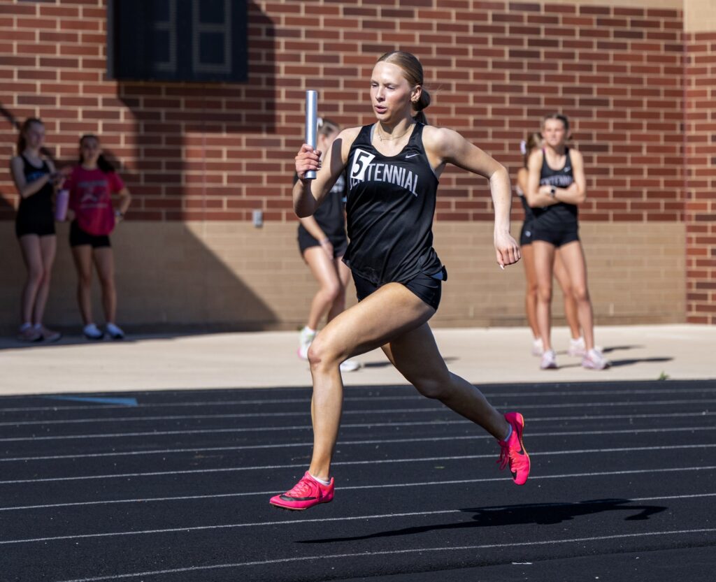 Centennial’s Anna Woods won the 100 hurdles in 15.49 seconds. She also anchored the winning shuttle hurdle relay, teaming up with Ava Barten, Siena Peddicord and Taylor Gilbreaith to post a time of 1:05.26.